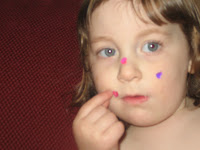 So my little girl in her high pitch voice goes "tank tu meemaw, tank tu" as she happened upon some stickers my mother bought for her. Now I say, thank you meemaw, thank you as I now have stickers on my toes, and my hands, my table and couch and of course, all over my little girl's face. It is tooo cute!!! Thankfully this time, Jonathan was out of reach!